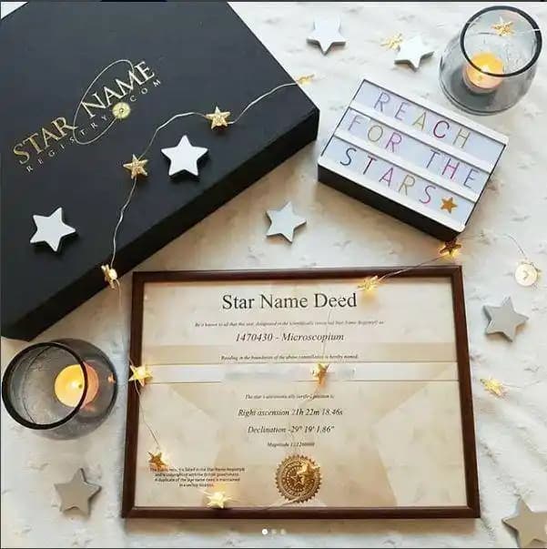 Nommez une étoile et recevez un certificat imprimé professionnellement et un dossier d'informations à n'importe quelle adresse.